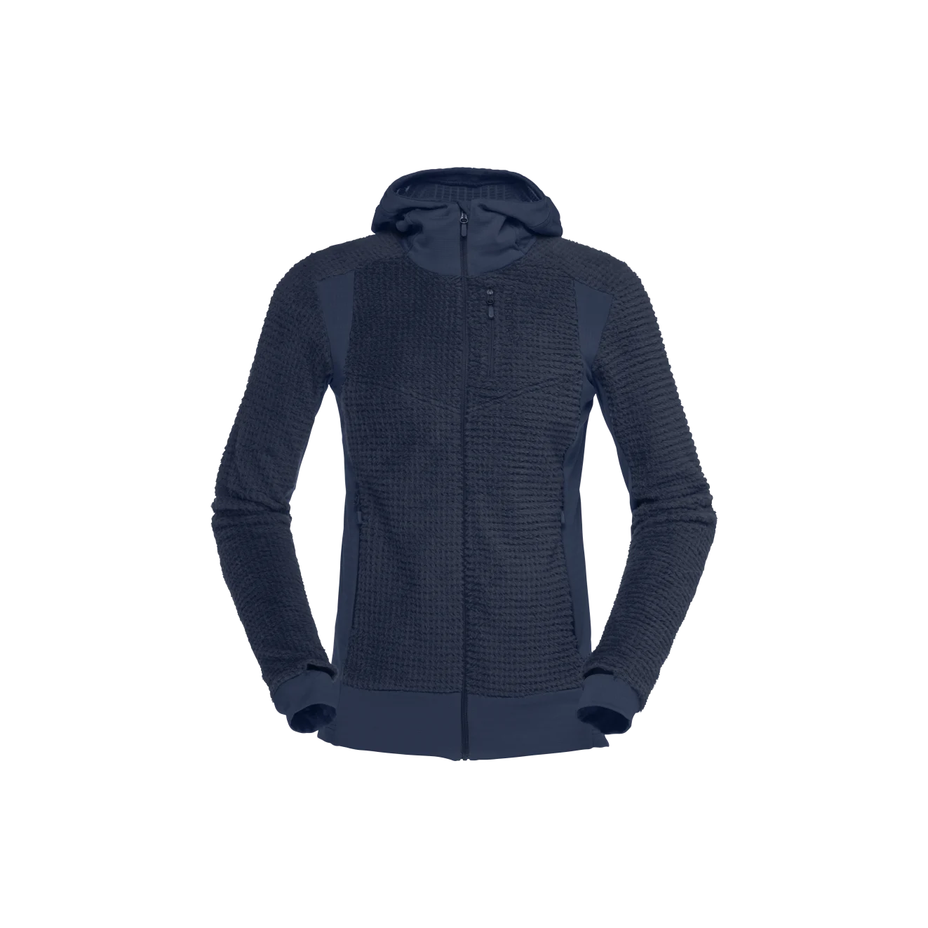 Vi har lagt til Polartec® Power Grid-materiale under armene og nedover på sidene for å sikre optimal bevegelsesfrihet, samt for å redusere mengden materiale på strategiske steder. Dette materialet har god stretch, pusteevne og fuktighetsabsorbering. Den har en atletisk og slank passform med integrerte håndgamasjer, håndlommer og en isolerende hette.